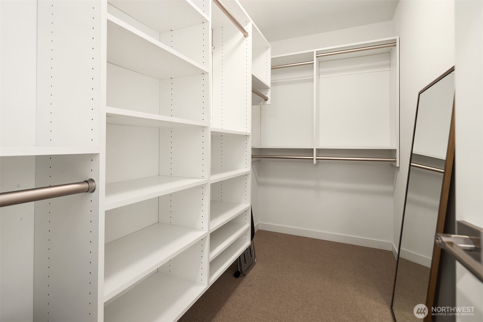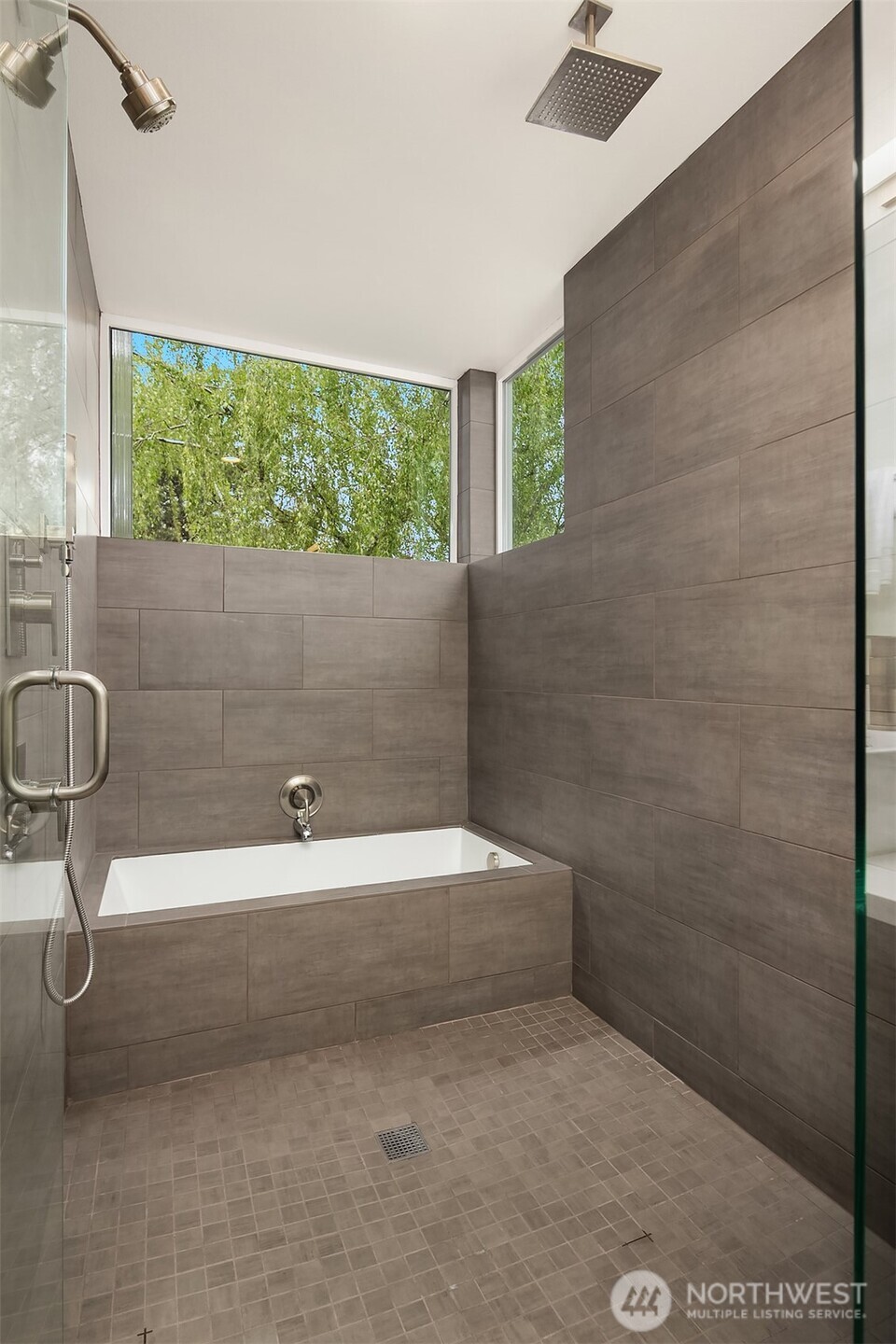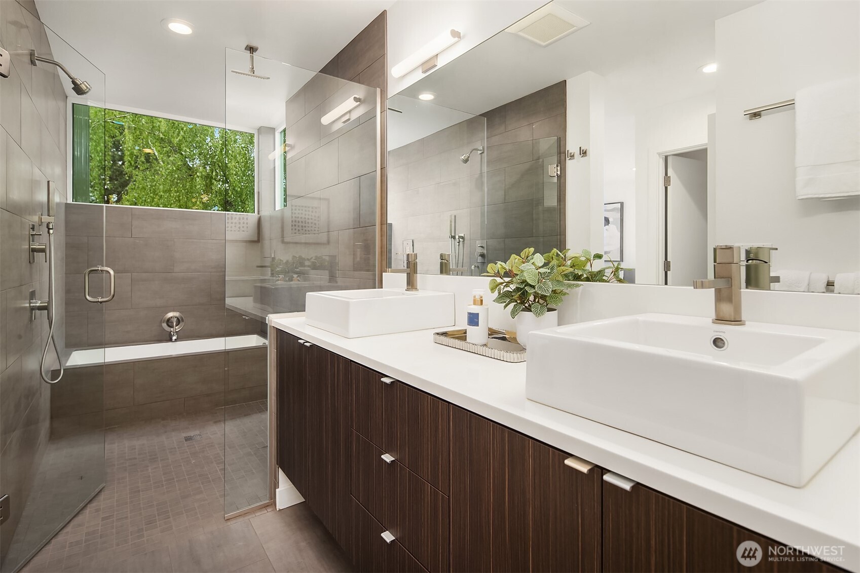 Primary suite with floor-to-ceiling windows, spa-like bath, double vanity, and walk-in closet